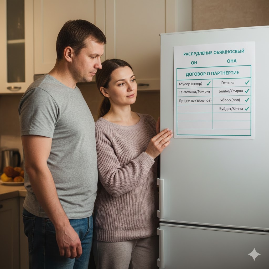 Попробуйте на этой неделе: сядьте с партнёром и составьте список всех бытовых задач в вашем доме. Отметьте, кто что делает сейчас. Посмотрите на дисбаланс (если он есть). Договоритесь о новом распределении. Запишите на лист, повесьте на видное место. Через месяц пересмотрите. Это просто, но это работает 📋