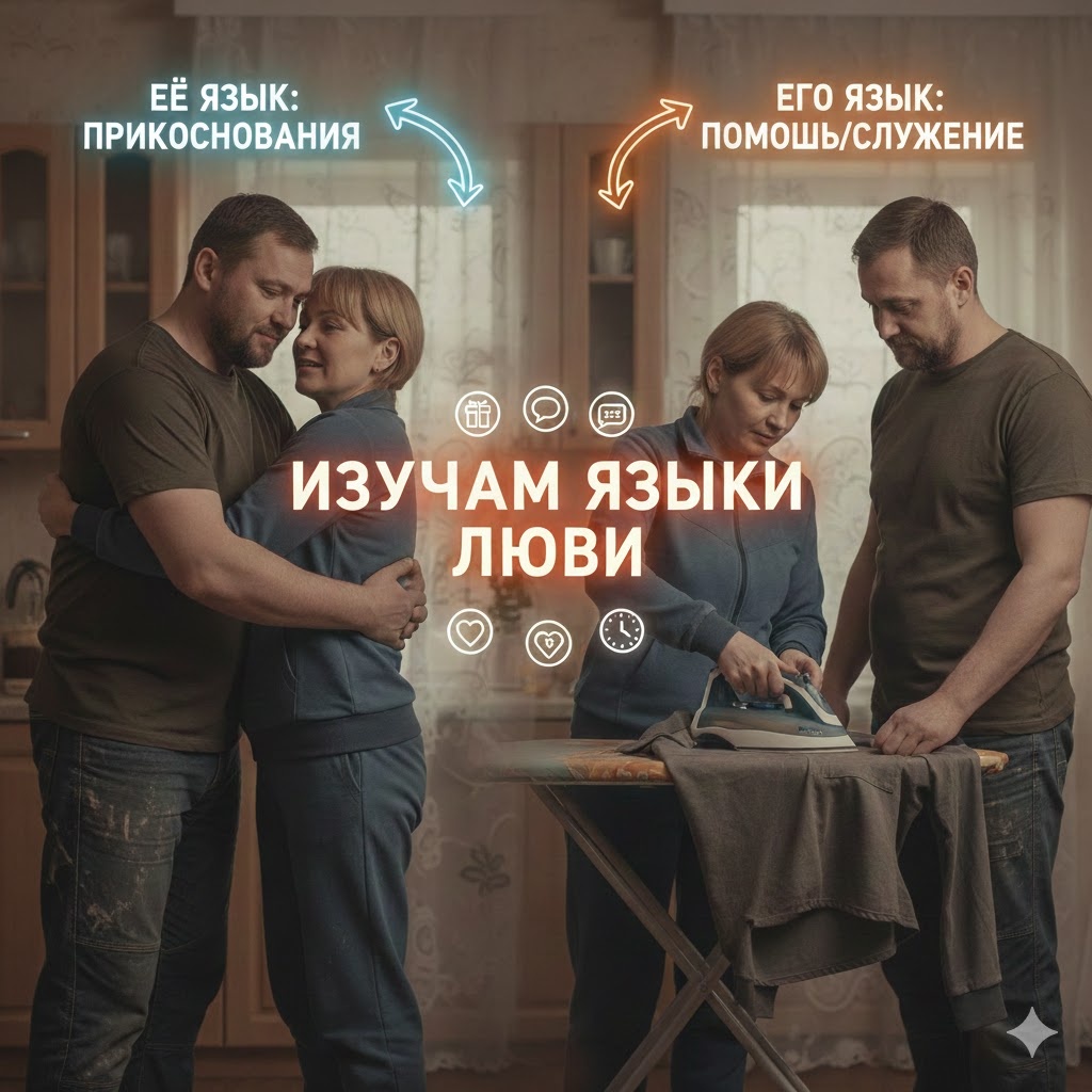Одновременно Мария училась говорить на языке Ивана (дела). Я спросил: "Маш, как ты показываешь Ване любовь?" — "Ну, готовлю, убираю, стираю". — "А он чувствует это как любовь?" — "Наверное... но он же говорит, что ему этого мало". — "Потому что его язык — помощь делами, но конкретная, для него лично. Ты делаешь общее (готовка для всех), а ему нужно личное". Мы придумали: Мария каждую неделю делает одну вещь специально для Ивана. Гладит его рубашки (он это ненавидит делать сам), готовит его любимое блюдо (пельмени, которые долго лепить), пришивает пуговицу на его куртке. Иван чувствовал: она делает это для него, не для семьи, для него. Это было его языком любви 🥟