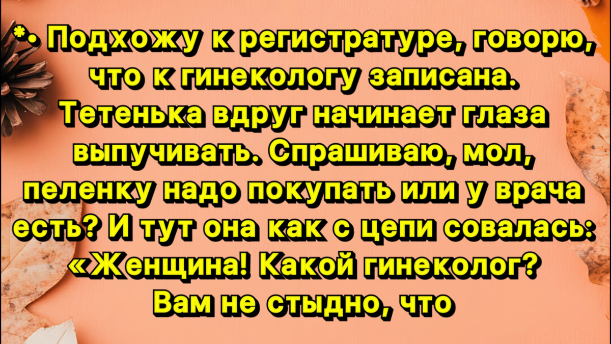 Подхожу к окошку регистратуры, говорю, что записана к гинекологу. Сотрудница вдруг делает круглые глаза. Я, ни о чем не догадываясь, спрашиваю: «А пеленку нужно покупать или у врача есть?». И тут на меня обрушивается гневная тирада: «Женщина! Какой гинеколог? Вам не стыдно? Позади вас мужчина стоит! Сначала пропустили бы его, а потом уже про пеленки спрашивали!». Я так и не поняла, в чем была моя вина.