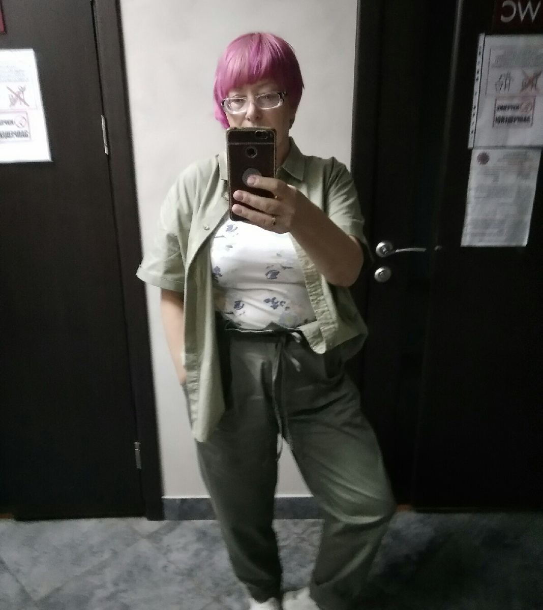 Я бы в парикмахерскую сходила для поднятия настроения, но у меня на голове короткая пикси, стричься только если налысо. Как-то было дело ко мне собрался песец, а я раз и сходила на напыление бровей, хоть и не мечтала и не очень хотела. Иногда чувствуешь, что приуныла вкрай, песец на пороге, можно предпринять что-то такое, что вообще не твое, выбивается из нормы. Вот и я взяла и пошла, к незнакомому мастеру по скидке и как ни странно очень хорошо получилось, прямо загляденье. Со стороны на фото и не видно что у меня брови нарисованные. Это потом до меня дошло как я рисковала. Розовым тонируюсь - знаете как дело первый раз было? Когда работала в колл-центре, не могла позволить себе хандрить - голос должен быть задорный. А песец частенько сидел на пороге, тогда муж только пару лет как ушел, конкретно плохо было. Так вот я пошла в Глорию и купила там штаны за 500 на распродаже, рубашку тоже где-то рублей за 700, все цвета хаки, стиль милитари и решила слегка затонировать волосы - тогда я блондинкой ходила. Тонировала Тоникой как водится - никогда эту заразу не покупайте! Не рассчитала и получилась у меня ярко-розовая шевелюра! Пришла на работу в новом образе: сама была в изумлении, коллеги в шоке, сын обозвал Лилу из пятого элемента. Песец удрал в панике. Я там фото нашла свое тех времен. Вроде времени прошло всего-ничего - пять лет, а как я постарела. Пожалуй сейчас я на такие эскапады не решусь - стала трусливее, боюсь выделяться, боюсь казаться фриком.