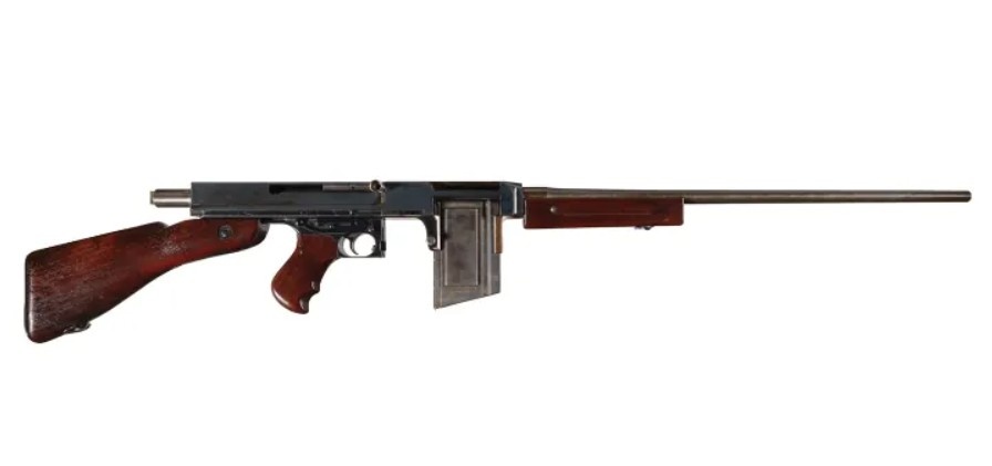 Пистолет-пулемёт Томпсона, несомненно, является одним из самых знаковых пистолетов-пулемётов XX века. Он показал себя чрезвычайно эффективным оружием, независимо от того, использовался ли он в качестве «траншейной метлы» в окопах Второй мировой войны или «печатной машинки» на улицах Чикаго. Неудивительно, что конструкторы решили расширить возможности этого оружия и разработали версию под патрон .30-06 Springfield. Этот единственный в своём роде экспериментальный образец модели Томпсона калибра 30-06 будет выставлен на предстоящем аукционе Rock Island Premier Firearms в декабре 2025 года. Подписывайтесь на наш канал в Telegram, чтобы получать больше материалов о необычном вооружении и военных технологиях. Этот зверь, разработанный в 1943 году компанией Auto Ordnance Corp, представляет собой самозарядную винтовку с 58-сантиметровым стволом и весом 7,7 килограммов без патронов. Он создан на основе пистолета-пулемёта Томпсона модели 1928 года и, судя по всему, имеет стандартный спусковой к