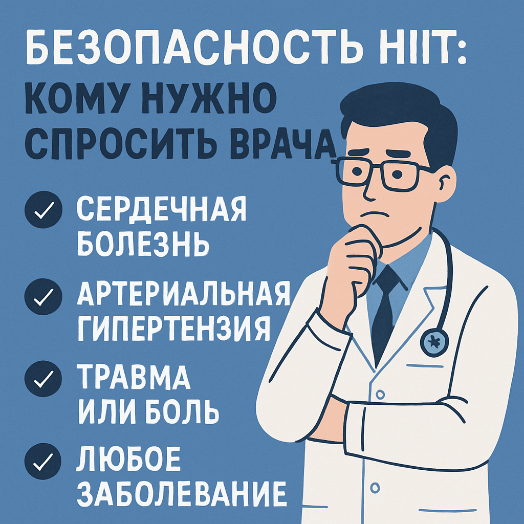 HIIT — мощный инструмент: коротко, интенсивно и с ощутимым результатом. Но именно из-за этой интенсивности интервальные тренировки подходят не всем. Если у вас есть хронические заболевания, особенно связанные с сердцем, суставами или дыханием, важно сначала поговорить с врачом. Это не формальность, а способ сделать тренировки безопасными и эффективными. ❤️ Сердце под контролем Во время HIIT частота сердечных сокращений поднимается до 85–95 % от максимума, и это серьёзная нагрузка.
