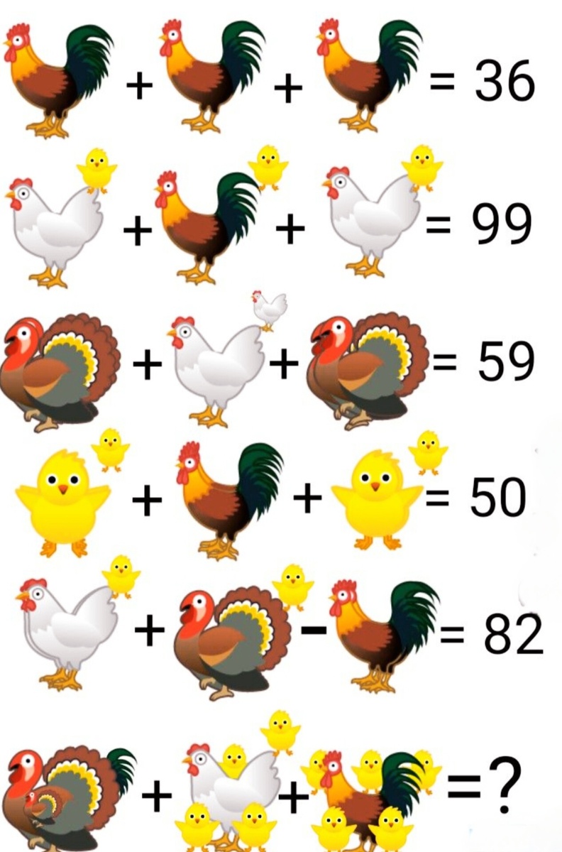 В данных равенствах за птицами прячутся натуральные числа. Разгадайте их и решите последний пример. В предыдущей публикации делала видео и обещала подписчикам показать свое решение. Показываю. 1) Из первого равенства можно сразу определить, какое число прячется за петушком. Вывод. За каждым петушком прячется цифра 9. Первая загадка разгадана: 🐓=9. 2) Перейдем к другому равенству 👇 Вывод. За цыплёнком прячется число 2. У второй птицы стало известно число: 🐥=2. 3) Пробуем догадаться, какое число представляет курочка. Рассмотрим равенство 👇 Вывод. За курочкой - натуральное число 3. У третьей птицы открылось число:🐔=3. 4) Перейдем к следующему равенству и найдем число, которое прячется за индюком. Вывод. Индюк представляет число 8. Последнее число разгадано: 🦃=8. Открылись все математические сезамы: 🐓=9 🐥=2 🐔=3 🦃=8 Подходят ли они к пятому равенству? 5) Проверим. Подставляем числа 👇 6) Добрались до примера, который надо решить. Считаем 👇 Задача решена. С