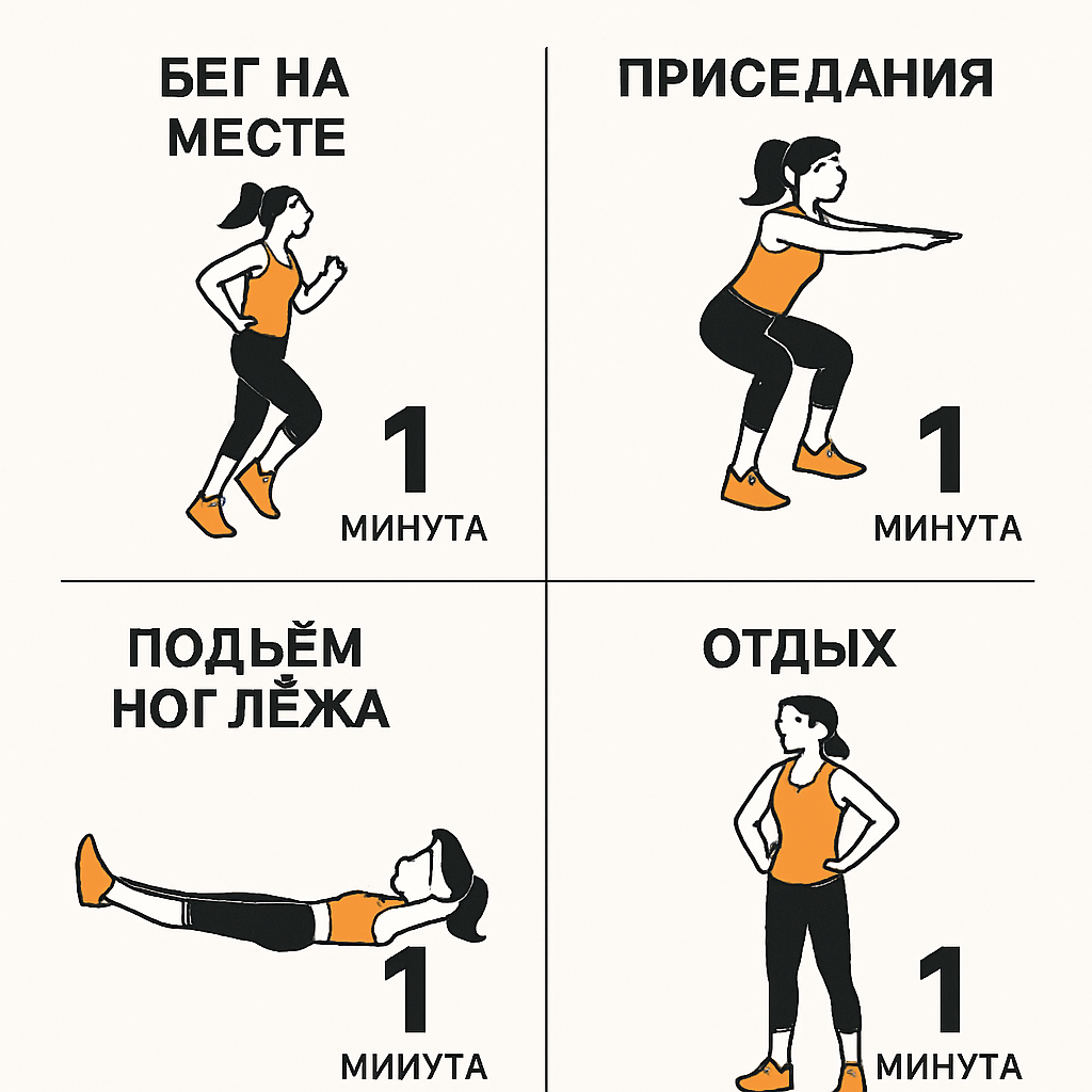 Хочешь начать интервальные тренировки, но боишься «умереть» после первого раунда? Отлично! Начни с формата 1/1 — это значит 1 минута активной работы и 1 минута отдыха. Такая схема безопасна, понятна и даёт тот самый эффект HIIT без перегрузки. ⚙️ Как работает формат 1/1 Суть проста: 1 минута — ты работаешь на хорошем уровне интенсивности (примерно 7 из 10 по ощущениям); 1 минута — восстанавливаешь дыхание, двигаешься медленно, но не садишься. Такой ритм позволяет новичкам развивать выносливость, не уходя в изнеможение, а со временем можно увеличивать темп или уменьшать паузы. 💡 Возьми таймер или приложение-интервальный секундомер — и тренировка пойдёт как по нотам. 🏃 Что можно делать в цикле Выбирай упражнения, которые тебе комфортны: Вариант 1 — без прыжков (щадяще для суставов): Приседания Отжимания от пола или с колен Планка Выпады назад Ходьба с высоким подниманием колен Вариант 2 — активный (для тех, кто хочет вспотеть): Берпи Прыжки на месте Бег на месте Приседания с прыжком