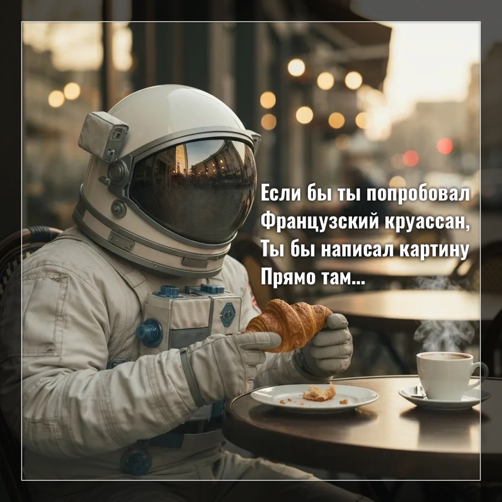 Если бы ты попробовал Французский круассан, Ты бы написал картину Прямо там. Свежая начинка, Тёплые слои, Хочется напитка, Терпкого как мы. Запахи багета, Цветов, американо Не дают покинуть Кофейню слишком рано. Мыслями не здесь, Паришь в цветных садах, Где светит ярко солнце, На райских островах. Выдохнешь тихонько Слабости свои, Чужие недовольства И зависти слои, Сделаешь глоток, Бодрящего напитка, Хрустящие слои, Свежая начинка, Ты снова в самой гуще Райских островов, Сливаешься с пространством Из Света и цветов.