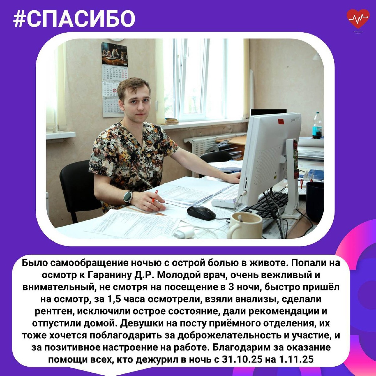Продолжаем публиковать благодарности, которые мы получаем от пациентов. На этой неделе размещаем благодарность хирургу БСМП - Дмитрию Гаранину. Оставить благодарность медикам можно сканируя QR-код с помощью камеры вашего смартфона. Коды находятся на кабинетах врачей в поликлиниках и стационарах.