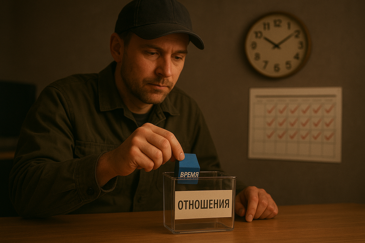 Артём: "Но я работал ради семьи! Я зарабатывал деньги!" Я: "Артём, сколько часов в неделю ты работал?" — "Шестьдесят. Я дальнобойщик, долгие рейсы". — "Сколько часов в неделю ты уделял жене — качественного времени, только вы вдвоём, без детей, без телевизора?" Артём: "Ну... почти ноль. В выходные я уставал, отдыхал. Или дети требовали внимания". — "Так. Ты инвестировал 60 часов в неделю в работу, 0 часов в жену. О чём это говорит?" Артём побледнел: "О том, что работа была приоритетом, а жена — нет". Точно. Немецкий социолог Никлас Луман писал: "Любовь — это инвестиция времени и внимания. Без инвестиций капитал любви обесценивается" ⏰