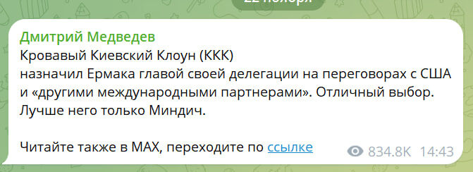 Именно так прокомментировал Дмитрий Медведев новость о назначении главы офиса Зеленского Ермака, руководителем делегации по мирным переговорам. Это плевок в лицо Трампу и потому действительно для нас это идеальный вариант. Но не для Украины. Ведь даже Трамп уже прямо говорит, что это для Киева ПОСЛЕДНИЙ ШАНС на сделку на этих условиях. Следующие будут хуже. И это правда.