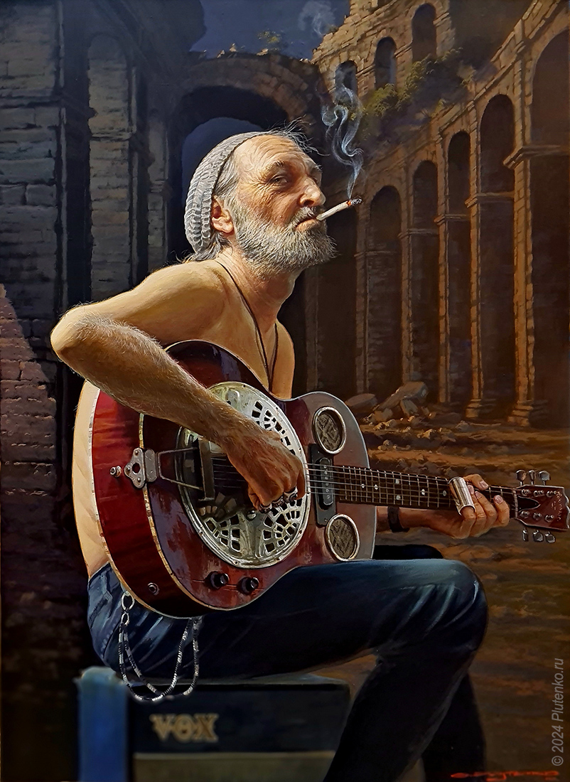 Холст, темпера, лак Первый раз такую гитару вижу. И где он играет? В Италии? Зодчий