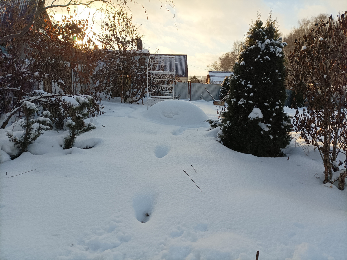 Ноябрь в этом году как никогда оказался щедрый на обилие снега. К тому же довольно теплый в нашем Кузбассе. Дневная температура чередуется от небольшого минуса до плюсовых. Ночью -5-10 град, морозов пока не было. Я немного переживала за теплицу на даче, как там со снегом. Тем более по прогнозу обещают снегопады на несколько дней. Ну и укрытия с розами проверить, может снежку куда подкинуть. И вот, 22 ноября, мы почти на даче, но доехать смогли только до своей аллеи, дальше уже сугробы. В прошлом году в это время доезжали до своих ворот. Я предполагала, что снега будет много больше, чем в городе, но чтобы так ровно и красиво лежал - не думала. Об укрытиях с розами напоминают только заметные ровные сугробы. 2 фото листайте Никакого выдувания не было и в помине, как в прошлые годы. Всё ровно укрыто белым пушистым снегом. Особенно красивым вид был сверху, с мансарды. 3 фото листайте Настоящая зимняя сказка! Со скального можжевельника Блю Эрроу почти полностью слетел цветной пододеяльник