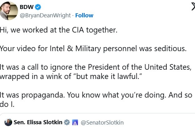 Pentagon 'MUST REFUSE ORDERS' from Trump — top US Representatives & Senators Slotkin, Kelly, Reps DeLuzio, Houlahan, Goodlander & Crow Ex-CIA Senator Slotkin urges 'SEDITIOUS' MUTINY