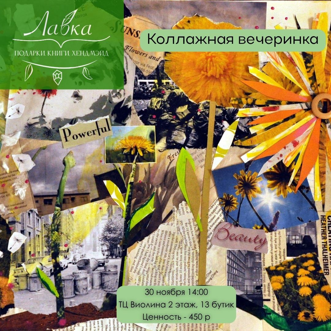 Приглашаем на коллажную вечеринку 30 ноября встречаемся на ней в "Лавке". Проведет ее Рина. 🕐30 ноября, 14:00 📍ТЦ "Виолина", 2 этаж "Лавка" 🪙 450 рублей 🔑запись на мероприятие в сообщениях @osamuilova #Новости Предложить публикацию:@zabkulisye_bot