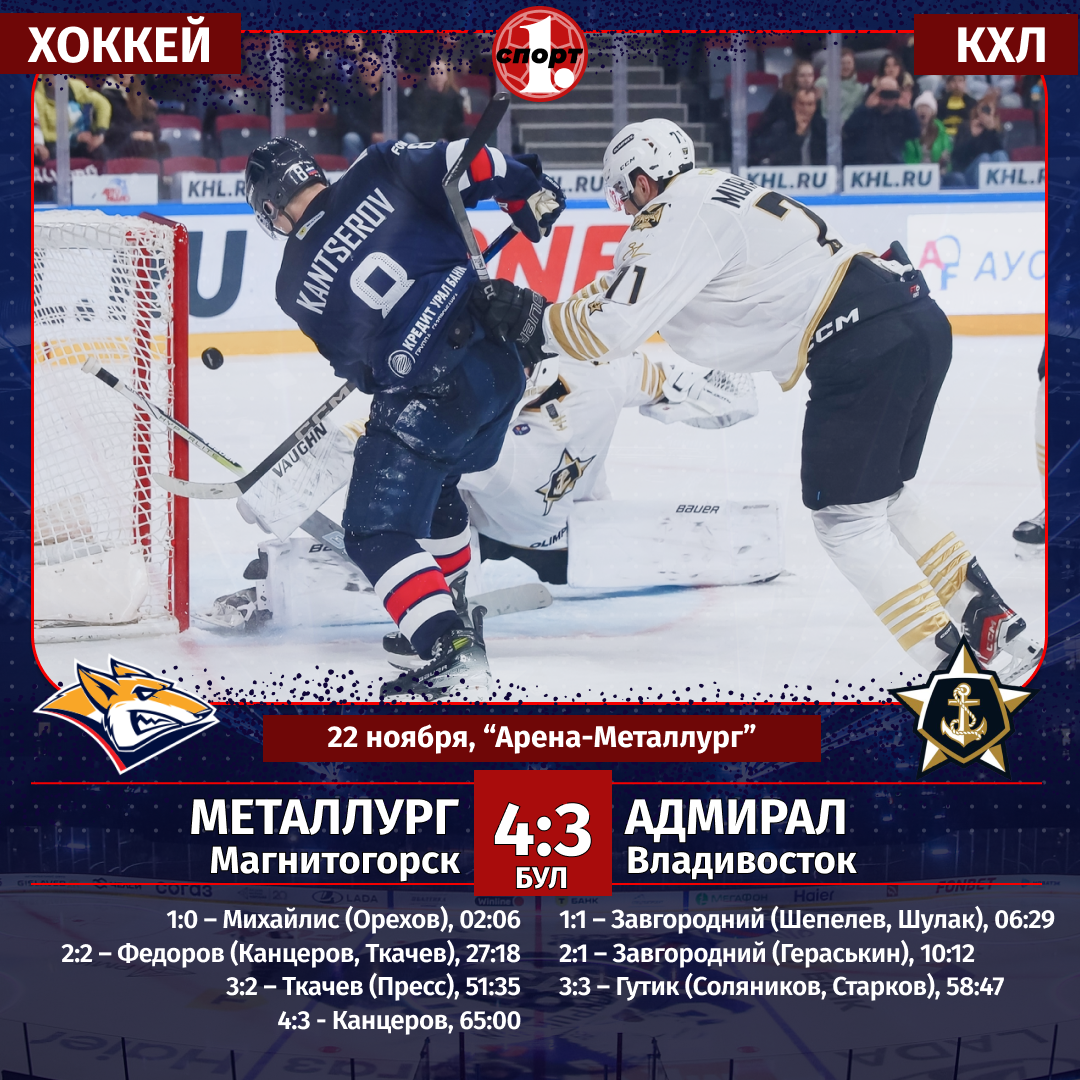 Магнитогорский «Металлург» в непростом поединке вырвал победу по буллитам в чемпионате КХЛ у «Адмирала» — 4:3. Этот матч стал юбилейным для форварда южноуральцев Владимира Ткачева. В своем 500‑м поединке в КХЛ он был одним из лучших на льду — забросил сам и ассистировал партнерам по команде, сообщает корреспондент ИА «Первое областное». Магнитогорцы быстро открыли счет в матче — уже на 3‑й минуте отличился Никита Михайлис. Но эта пропущенная шайба не произвела никакого впечатления на «моряков». На 7‑й минуте они организовали быструю контратаку, в которой с «пятака» поразил ворота хозяев форвард Дмитрий Завгородний. Он же в середине периода вывел гостей вперед. Причем сделал это в меньшинстве, и вновь успех «Адмиралу» принесла контратака. Удивительно, но еще в первом периоде Завгородний мог оформить и хет-трик, но шайба после его броска угодила в штангу. Отметим, что в самой концовке первой 20‑минутки близок был к тому, чтобы оформить дубль Никита Михайлис. Робин Пресс вывел его на хоро