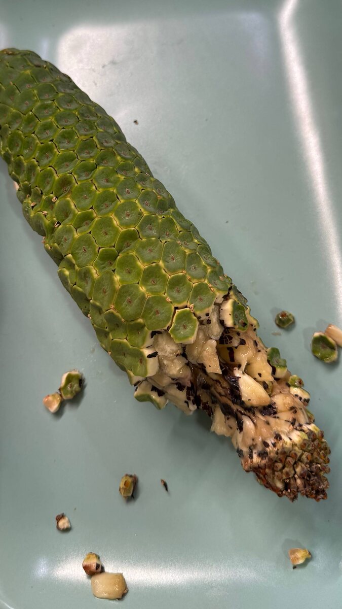 В зимнем саду Дворца творчества детей и молодёжи в Томске растёт взрослая монстера, которая плодоносит… В прошлом году её плоды дозрели к Новому году, и тогда я впервые увидел эту новость… конечно, сразу попросил попробовать. Спустя год история повторилась, початки поспели, а про меня вспомнили и один из плодов сегодня попал ко мне на дегустацию. Внешне - кукурузина, на вкус мякоть пропитанная ананасом и клубникой, с лёгкой вяжущей и обжигающей нотками. Но главное, монстера деликатесная - реально деликатесная, в прямом смысле слова. Я, естественно, в восторге дичайшем. Надеюсь, это будет не последний пост в этом канале…