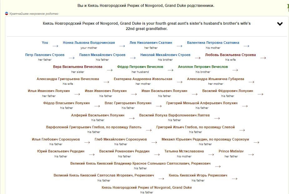 Случайно обнаружил, что состою в родстве с династией Рюриковичей Я писал на этом канале о том, что при желании и упорстве можно доказать своё родство с любой знаменитостью. https://m.dzen.ru/a/ZRTtjnxqDWQbZvIN Когда писал это, не подозревал каким знаменитостям и каким образом являюсь роднёй. Я зарегистрирован на сайте "Geni". Там можно выяснить, является ли твоим родственником кто-то из людей, о которых на сайте есть информация. Причём достаточно открыть только страницу, посвящённую этому человеку. Я из любопытства открыл страницу Рюрика, и вдруг сайт сообщает мне, что мы родственники, а потом выдаёт мне такое древо. Начинаю разбираться подробнее. Выясняю, что у моего прапрапрадеда историка Павла Михайловича Строева был младший брат Николай, действительный статский советник, выпускник Московского университета, чиновник Министерства юстиции, входивший в круг знакомых Тютчева. Так вот Николай Михайлович Строев был женат на Любови Васильевне Жарковой, которая была моложе мужа на 4