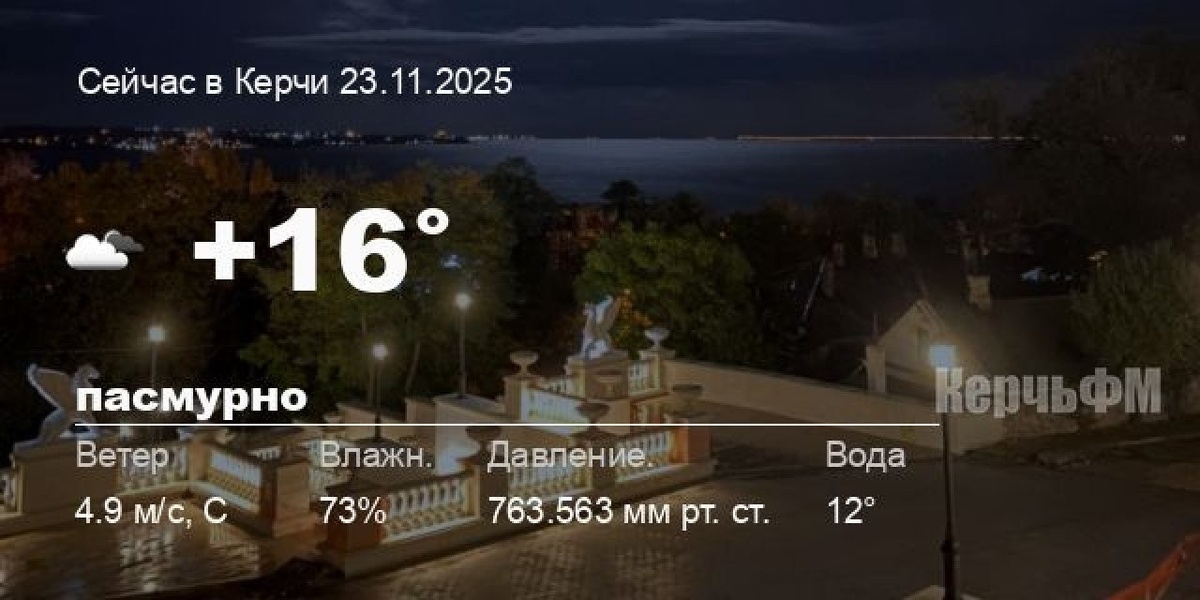 Погода в Керчи 23 ноября Сегодня днем в Керчи, 23 ноября, ожидается пасмурная погода, температура воздуха от +13.6° до +17.1°С, ветер северный 5.48 м/с, порывы до 6.4 м/с, давление 762.1 мм рт. ст., влажность 65%. Ближайшей ночью ожидается пасмурная погода, температура +13.9°С. Завтра, 24 ноября, в течение суток ожидается пасмурная погода; ночью +13.9°С, днем +15.6°С, ветер северный 3.16 м/с. - Феодосия от +14.3° до +15.8°С, ☁️ пасмурно, море: 15°C - Судак от +13.3° до +14... подробнее Подписывайся на КерчьФМ.РФ @kerchfm