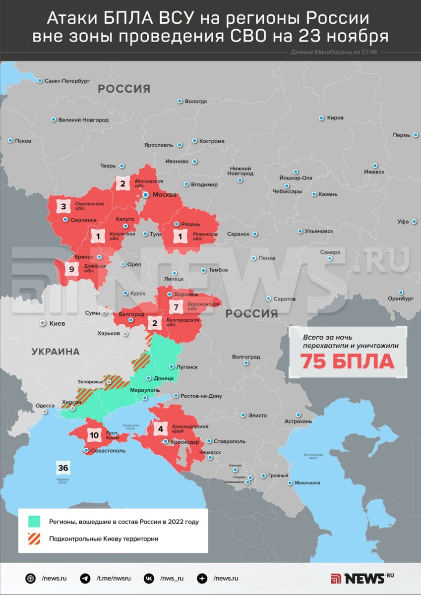 Силы ПВО за ночь уничтожили 75 беспилотников над регионами России, сообщили в Минобороны. 36 дронов перехватили над акваторией Черного моря, 10 — над Крымом, девять — над Брянской областью, семь — над Воронежской, четыре — над Краснодарским краем, три — над Смоленской областью, два — над территорией Московского региона, еще два — над Белгородской областью, по одному — над Калужской и Рязанской областями. ⭕️ Подписаться | Мы в MAX | Буст