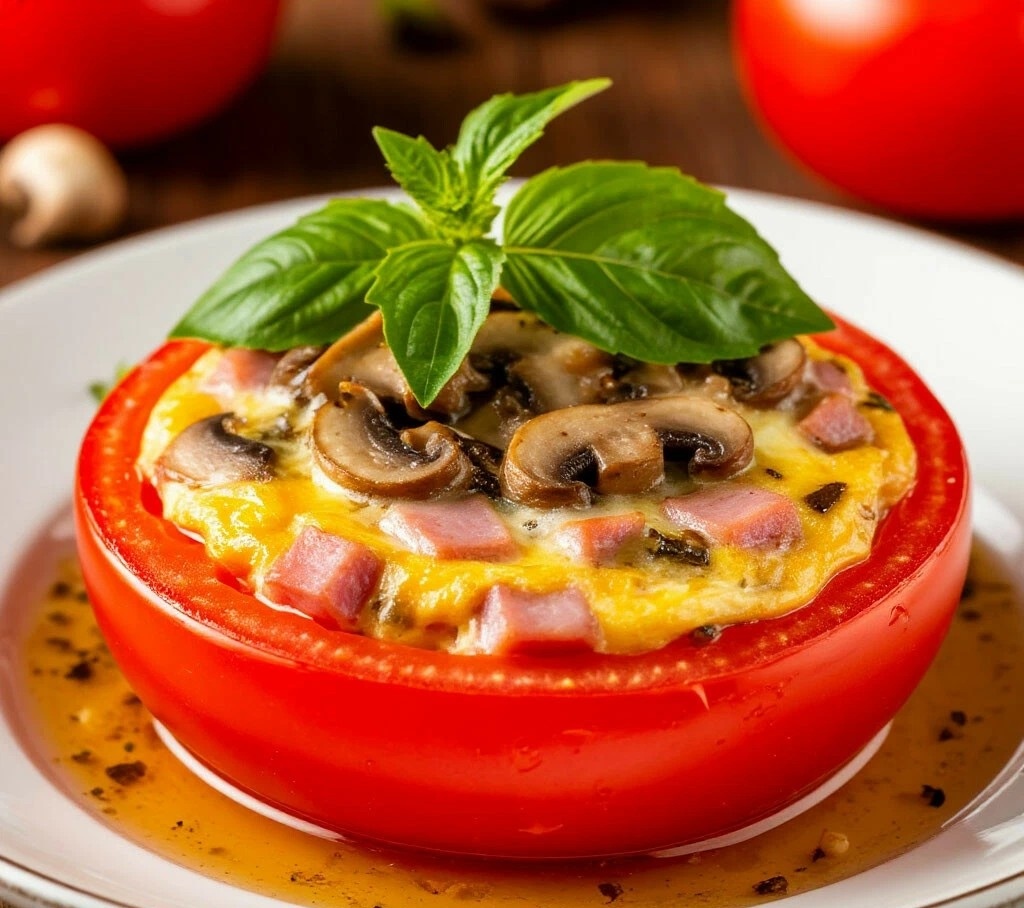 ЗАВТРАК — ОМЛЕТ В ПОМИДОРЕ С ВЕТЧИНОЙ И ГРИБАМИ 🍅 Мяу, мои пушистые сонь! 😸 Даже завтракать лень? Этот омлет готовится прямо в помидорной «тарелке» — мыть посуду почти не придется! 🍳✨ ОМЛЕТ В ПОМИДОРЕ С ВЕТЧИНОЙ И ГРИБАМИ 🍅 ИНГРЕДИЕНТЫ (на 1 порцию): 🧾 ·Помидор крупный — 1 шт. (200-250 г) 🍅 ·Яйцо — 1-2 шт. 🥚 ·Ветчина — 50 г 🥓 ·Шампиньоны свежие — 50 г 🍄 ·Сыр твердый — 20 г 🧀 ·Зелень (петрушка, укроп) — 1 ч.л. 🌿 ·Соль, перец — по вкусу 🧂 ·Масло растительное — 1 ч.л. ВРЕМЯ ПРИГОТОВЛЕНИЯ: ⏰ 5-7 минут СЛОЖНОСТЬ:🐾 Проще кошачьей потягушки! ПОШАГОВЫЙ РЕЦЕПТ: 👩🍳 1. Подготовка помидора: Срежьте верхушку помидора. Аккуратно ложкой выньте мякоть с семенами, чтобы получился «стаканчик». Мякоть не выбрасывайте. 🥄 2. Начинка: Грибы и ветчину мелко нарежьте кубиками. Разогрейте сковороду с маслом, обжарьте грибы и ветчину 2-3 минуты до легкой румяности. Добавьте мякоть помидора, тушите еще 1-2 минуты. 🍄🥓 3. Заливка: Яйца взбейте вилкой с солью и перцем. Смешайте с обжаренными