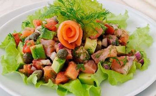 Ингредиенты: - 1 авокадо - 200 г филе копченого лосося - 1 луковица - ½ болгарского перца - 1 пучок листового салата - 100 г каперсов - 2 ст. л. оливкового масла - ½ лимона - 1 ч. л. соевого соуса - 2 щепотки сушеного базилика - соль по вкусу - укроп для украшения Приготовление: Филе лосося нарезать кубиками (несколько полосок лосося отложить), сбрызнуть рыбу лимонным соком и оставить на 15 минут. Авокадо почистить, удалить косточку и нарезать вместе с болгарским перцем кубиками. Лук почистить и мелко нарезать. В миске смешать рыбу, лук, перец и авокадо, добавить каперсы. Соединить оливковое масло, 1 ст. л. лимонного сока и соевый соус. Добавить сушеный базилик. Заправить этой смесью салат, посолить и перемешать. На тарелку выложить листовой салат, на него горкой уложить заправленный салат. Посыпать все рубленным укропом. Из отложенных полосочек лосося свернуть розочки и украсить салат.