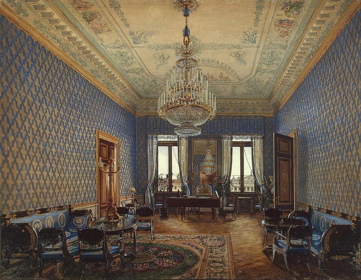Константин Андреевич Ухтомский (1818 - 1881), русский живописец-акварелист, мастер интерьерного портрета, архитектор; сын гравёра Андрея Ухтомского, ученик Максима Воробьёва. Один из создателей галереи интерьеров исторических залов Зимнего дворца и Эрмитажа времён царствования Николая I и Александра II, автор проекта домовой церкви Инженерного училища в Михайловском замке. Академик (1843) и почётный вольный общник (1855) Императорской Академии художеств, действительный статский советник (1872). Виды залов Зимнего дворца. Гостиная великой княжны Марии Николаевны