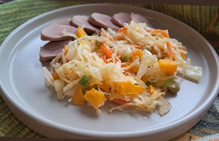 🍂 Поздняя осень, пора готовить что-то с тыквой. 🍂 Винегрет я давно готовлю себе без картошки и подумала, что почему бы не приготовить и без свеклы? Заменю ее тыквой! Кроме свеклы у меня еще и огурцов соленых нет. Так что будет тыква, квашенная капуста, зеленый горошек, зеленый лук, масло. 🍂 Тыкву можно запечь или поджарить. Поджарить быстрее 🍂 В произвольных пропорциях берем капусту, лук, горошек 🍂 Добавляем тыкву вместе с маслом со сковороды. Мала может быть не достаточно, тогда добавляем еще 🍂 Мне понравилось сочетание и на вкус и на цвет