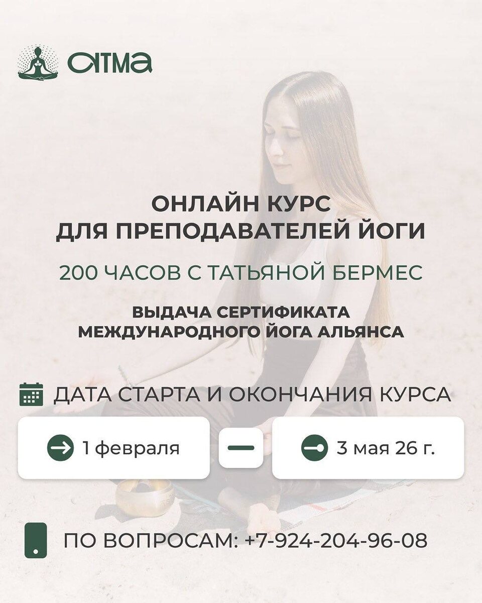 ОНЛАЙН курс для преподавателей йоги с выдачей сертификата Йога Альянса 200 часов. Базовый курс, где вы получите знания о том, как преподавать качественно и безопасно на всех уровнях, углубитесь в практичную анатомию и физиологию хатха -йоги, получите основные знания философии. Также этот курс подходит тем, кто просто хочет углубить свою личную практику. Даты: 🗓️ 1 Февраля - 3 Мая - онлайн трансляции. Исходя из трехлетнего опыта проведения курсов для освоения обширного объема материалов курса нужно больше времени поэтому я даю 2 месяца после окончания на самостоятельное обучение и сдачу экзаменов. 📙Предметы: -Личная практика: асаны, шаткармы, пранаямы, мудры, бандхи; - Анатомия и физиология - курс прослушивается в записи+консультации по лекциям; - Философия - курс прослушивается в записи+консультации по лекциям; - Отстройки и правки в асанах; - Практика ведения; - Построение последовательностей. 📋Расписание: (Время по Хабаровску, может измениться после набора группы) Вторн
