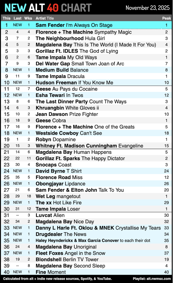 Еженедельно рассчитывается на основе десятков альтернативных и инди-новинок и потоковой активности на основных сервисах. Последнее обновление: 23 ноября 2025 г.