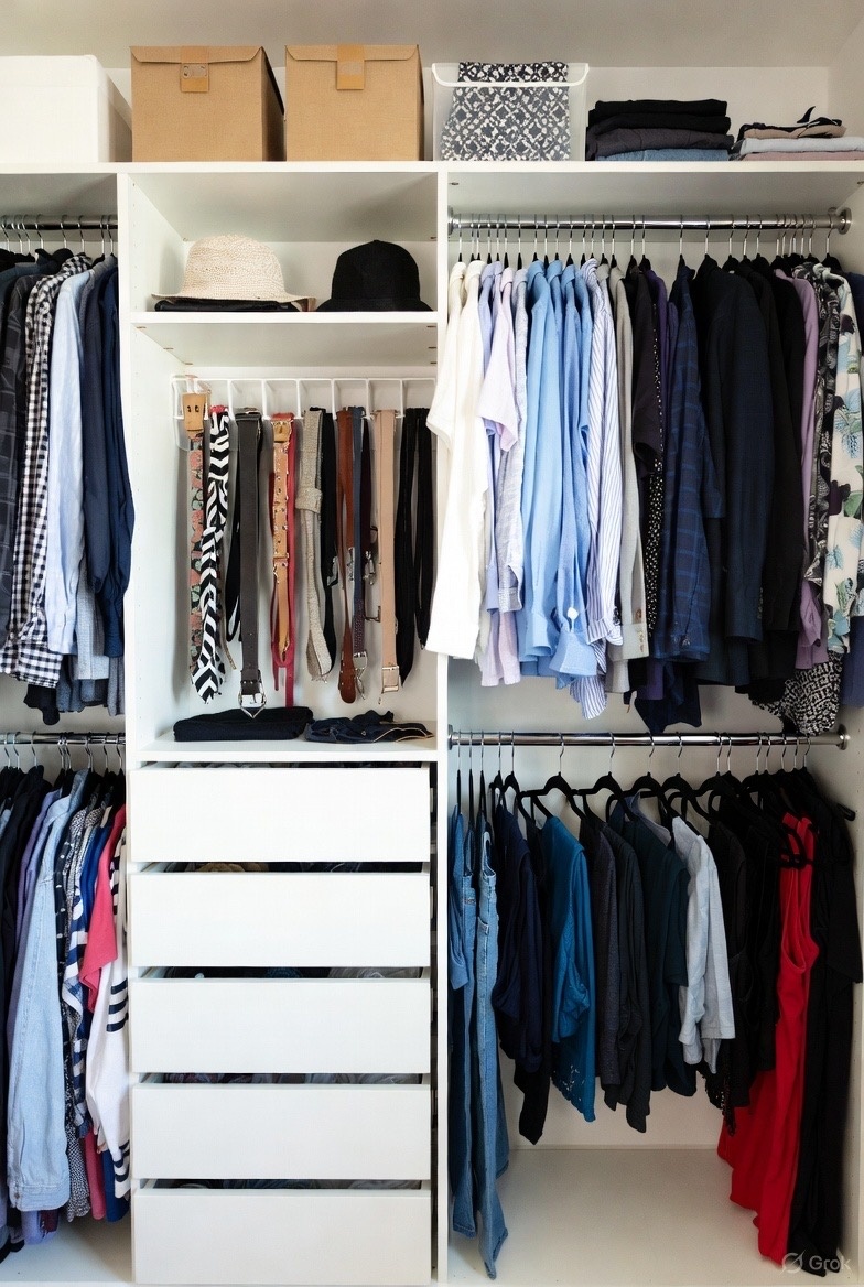 Мой гардероб долгое время жил своей жизнью: одежда свалена слоями, пропавшие футболки, случайные покупки, о существовании которых я вспоминал только при переезде 🙃. И вот однажды я решил: хватит хаоса, пора создать шкаф, в котором всё логично, красиво и удобно. Делюсь тем, что работает идеально 👇 Первый шаг — понять, какие вещи действительно нужно хранить. Я разделил гардероб на категории: И только после этого стал думать о конструкции. Это спасло меня от покупки «красивых, но бесполезных» полок. Чтобы шкаф был удобным, я организовал его так: После этого мои вещи перестали бороться за пространство. Я выбрал тонкие бархатные плечики одного цвета. Звучит мелочно, но шкаф сразу стал выглядеть: ✨ аккуратно ✨ дорого ✨ просторнее И одежда перестала сползать на пол 🙌. Я наконец-то признал: мелкие вещи без коробок — это бесконечный хаос. Теперь у меня есть: Так каждая вещь знает свой дом. Открытая часть шкафа — для того, что выглядит аккуратно: А всё яркое, сезонное или «визуально шумно