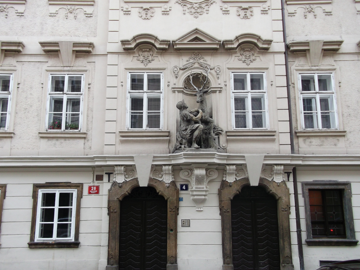 Примерно в конце VII столетия знатный человек по имени Губерт отправился на охоту. Хотя... Наверно, я тороплюсь. Начнем по-другому. Многие старые дома в Праге носят интересные названия вроде "У золотой лилии" или "У черного коня" благодаря старинным домовым знакам - об этом у меня есть статья, дам на нее ссылку в конце этого текста. Но есть дома с оригинальными персональными названиями, полученные не благодаря вывескам, а за счет скульптурного оформления. Один из них - дом "У золотого оленя" на улице Томашской в районе Мала Страна. Дом построили в середине XVI столетия, а в 1720-х годах реконструировали в стиле бароко. Именно тогда на его втором этаже появилась скульптура, привлекающая внимание туристов. Гиды могут рассказать, что: Но и то, и другое - лишь предположения. Дело в том, что во время реконструкции дома оба мастера работали в находящемся поблизости монастыре св. Томаша, и им могли предложить дополнительный заработок. Однако документально это никак не подтверждается. Ну а те