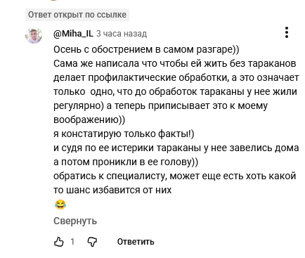 @Miha_IL честно говоря, интересное у вас воображение! Я не говорила, что у меня есть проблемы с насекомыми, и, если честно, ни совета, ни рецепта у вас не спрашивала. Но вы сами решили провести такую аналогию, как будто я сидела и жаловалась на тараканов и муравьёв. Если честно, ваша логика меня немного удивляет. Если её перенести на людей, то выходит, что от больных нужно просто избавляться, чтобы «здоровым не мешали». Но это ведь… ну, мягко говоря, не лучший подход, правда?