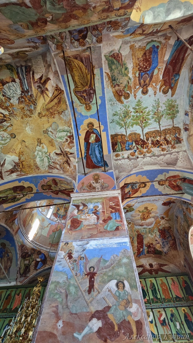 Погнали на Север! Автопутешествие с собакой. День 10. Александро-Свирский монастырь. Часть 3 А теперь давайте заглянем в главный храм Троицкого комплекса — Троицкий собор. В 1710-м, храм расписали от пола до потолка. И вот что самое потрясающее — эти уникальные фрески сохранились до наших дней практически в первоначальном виде! Про них ходит легенда, будто бы они «самообновляющиеся», но ценность их вовсе не в этом мистическом свойстве. Главное — их содержание. Основу росписи, как водится, составляют библейские сюжеты. На стенах — евангельские истории и внушительная картина Страшного Суда (классика жанра, без этого ни один уважающий себя храм не обходился). Но вот что делает его уникальным — так это роспись на столпах. Именно на них развернулась вся история Ветхого Завета. Адам и Ева, Ной с его ковчегом, жертвоприношение Авраама... В других храмах такое увидишь нечасто. Получается, что, обходя собор по кругу, ты буквально листаешь древнюю Библию в картинках. Это как редкое коллекци