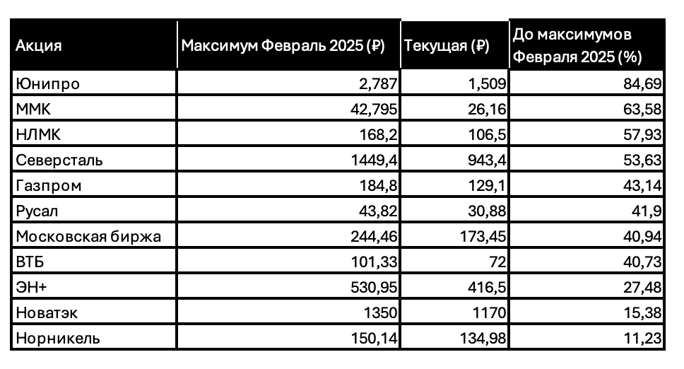 Не стоит делать основной акцент на столбец «До максимумов Февраля 2025», изменились показатели бизнеса, перспективы, возможности и много других факторов. Данный максимум не является историческим и в будущем может быть перебит, так и остаться надолго на вершине. Не забываем про инфляцию и доходность низкорискованных инструментов, которые за год дали более 15%.
