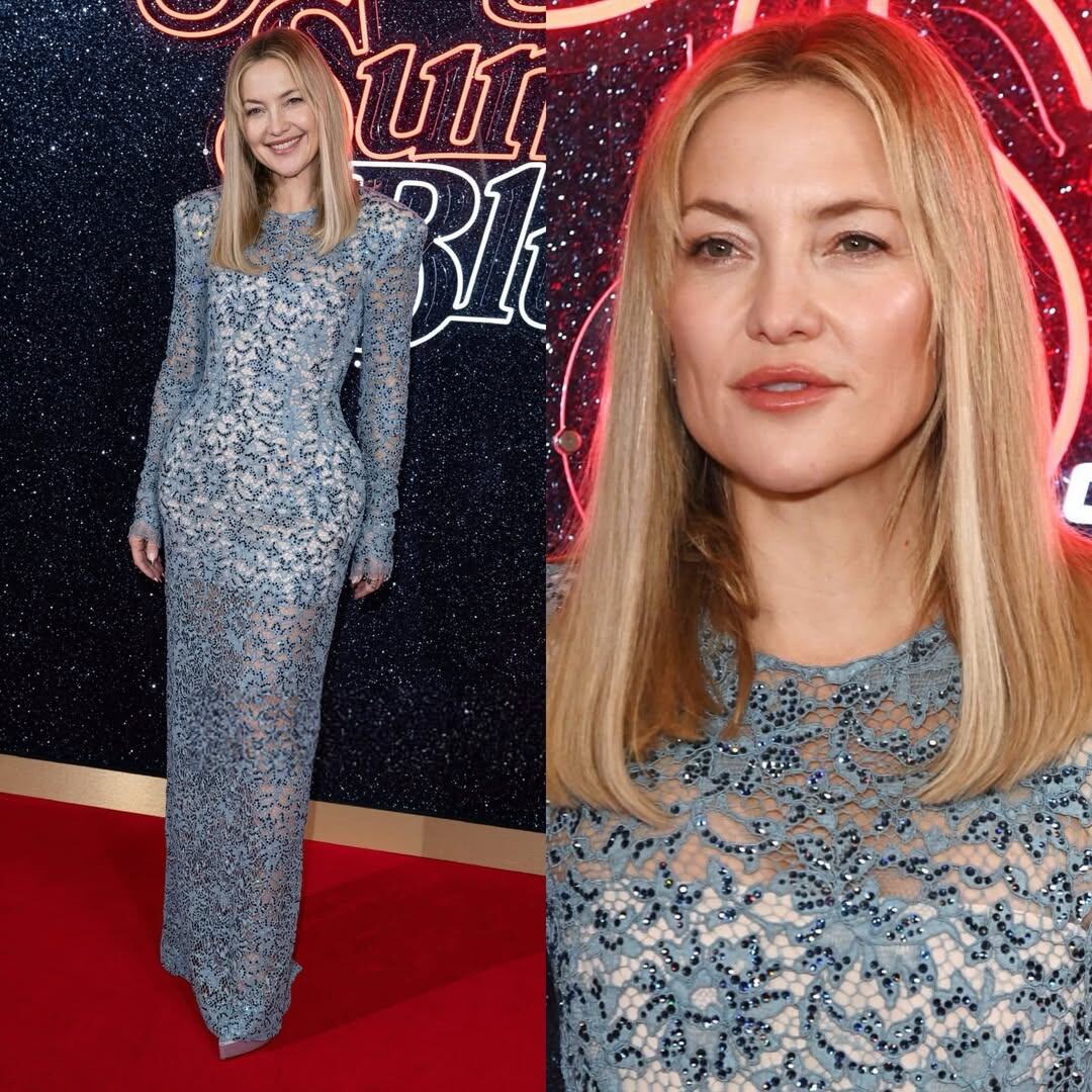 На премьере Song Sung Blue Кейт Хадсон выбрала платье Stella McCartney с действительно интересным кроем. Внизу заметны дополнительные корсетные вставки, которые создают объём по бёдрам и формируют модный силуэт песочные часы. За счёт такой конструкции платье идеально садится на фигуру, подчёркивает плавные линии и даёт то самое ощущение гламурности, которое считывается сразу. Кружево выглядит современно благодаря аккуратной вышивке и сложному голубому оттенку. В движении ткань мягко мерцает, но не перегружает образ. Платье выглядит продуманным, цельным и точно подобранным под энергетику Кейт — и по цвету, и по фактуре, и по общей подаче. Бьюти-образ актриса оставила максимально спокойным. Распущенные прямые волосы, почти незаметный макияж, акцент на чистой коже. Из аксессуаров она выбрала мерцающий клатч и несколько крупных бриллиантовых колец, которые работают как аккуратные акценты и не спорят с кружевом. Этот выход Кейт — пример того, как правильно подобранное платье может раскрыть