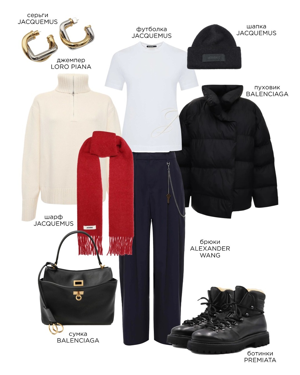 В осенне-зимних коллекциях 2025/26 пуховики вновь становятся неотъемлемым элементом люксового стиля — и главное, что они могут быть одновременно функциональными и элегантными. Ниже — вдохновляющие идеи и рекомендации для тех, кто хочет инвестировать в пуховик на зиму, не жертвуя стилистикой. 1. Оверсайз-пуховик Для каждодневного использования идеально подойдёт объёмный пуховик свободного кроя — как уютное одеяло. Такой силуэт вписывается в городскую жизнь, отлично сочетается с базовым гардеробом: широкими шерстяными брюками, мягкими свитерами и плотным денимом. Мягкая форма создаёт ощущение лёгкости, а при этом сохраняет тепло. Именно такие объемные модели популярны в трендах последних сезонов. Совет: выбирайте вариант с функциональным капюшоном и застёжками, чтобы защититься от ветра без необходимости надевать громоздкий шарф. Шапка, серьги, пуховик, джемпер, футболка, брюки, шарф, сумка, ботинки 2. Глянцевый или металлик Пуховики с приглушённым блеском возвращаются в моду — материал