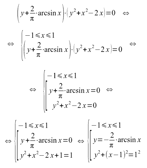 Построить на координатной плоскости график уравнения: (y + 2/π·arcsin x)·(y² + x² – 2x) = 0 Первое, на что следует обратить внимание – уравнение как математическое выражение имеет смысл при выполнении условия –1 ⩽ x ⩽ 1, диктуемого ограничением на возможные значения аргумента арксинуса. Левая часть уравнения представляет собой произведение двух множителей, а произведение равно нулю, когда хотя бы один из множителей равен нулю. Отсюда имеем: Последняя полученная запись означает, что график исходного уравнения представляет совокупность двух линий. Первая – график функции , который есть график арксинуса y = arcsin x , перевёрнутый вокруг оси абсцисс и отмасштабированный по вертикали в 2/π раз («сжатый» в π/2 раз) – рис. 1. Вторая линия представляет левую половину окружности единичного радиуса с центром в точке (1; 0) – рис. 2. «Половинчатость» обусловлена требованием для переменной x, которая может принимать значения из диапазона [–1; 1]. Другие задания, имеющиеся на канале, можно найти