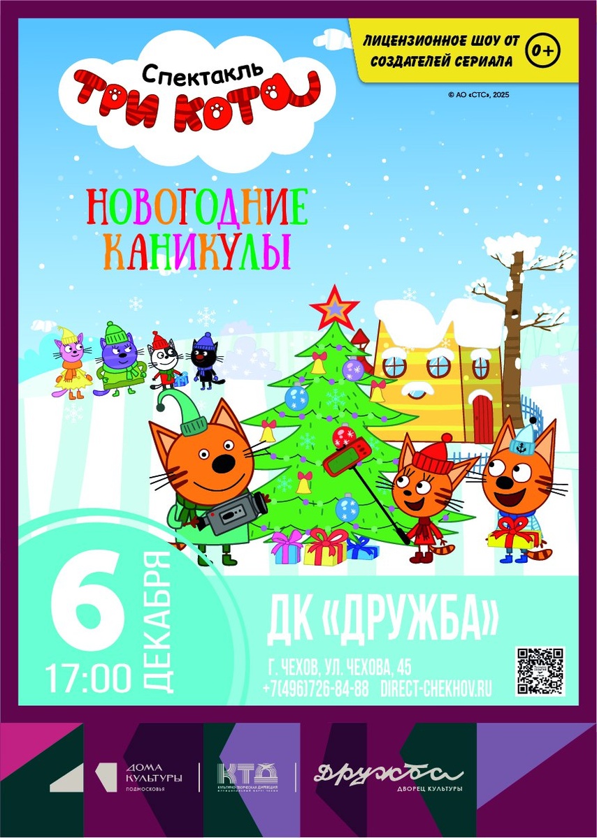 ✨ Три Кота: Новогодние Каникулы! 🎄В этом году котята никуда не едут на каникулы и остаются дома. После долгих споров и раздумий котята со своими друзьями решили устроить дома настоящий новогодний карнавал. 🎊 😻😸🐱Все котята на одной сцене: Коржик, Карамелька, Компот, Сажик, Мама кошка, Папа кот и Кот Мороз! ⏰Продолжительность 60 минут без антракта. Рекомендованный возраст 3-8 лет. 🚫 Возраст: 3+ 📆 06.12.2025 🕛 17:00 🏢 ДК «Дружба» 📍 г. Чехов, ул. Чехова, д.45 💰 Цена от: 800 до 1600 ₽ 🔗 Купить билет: https://clck.ru/3QCZ2d ⭐Поддержать канал голосом ✅ Мероприятия Чехов https://dzen.ru/id/66cc4b48e9ef144699238a51 http://vk.com/chekhov_events http://dzen.ru/chekhov_events