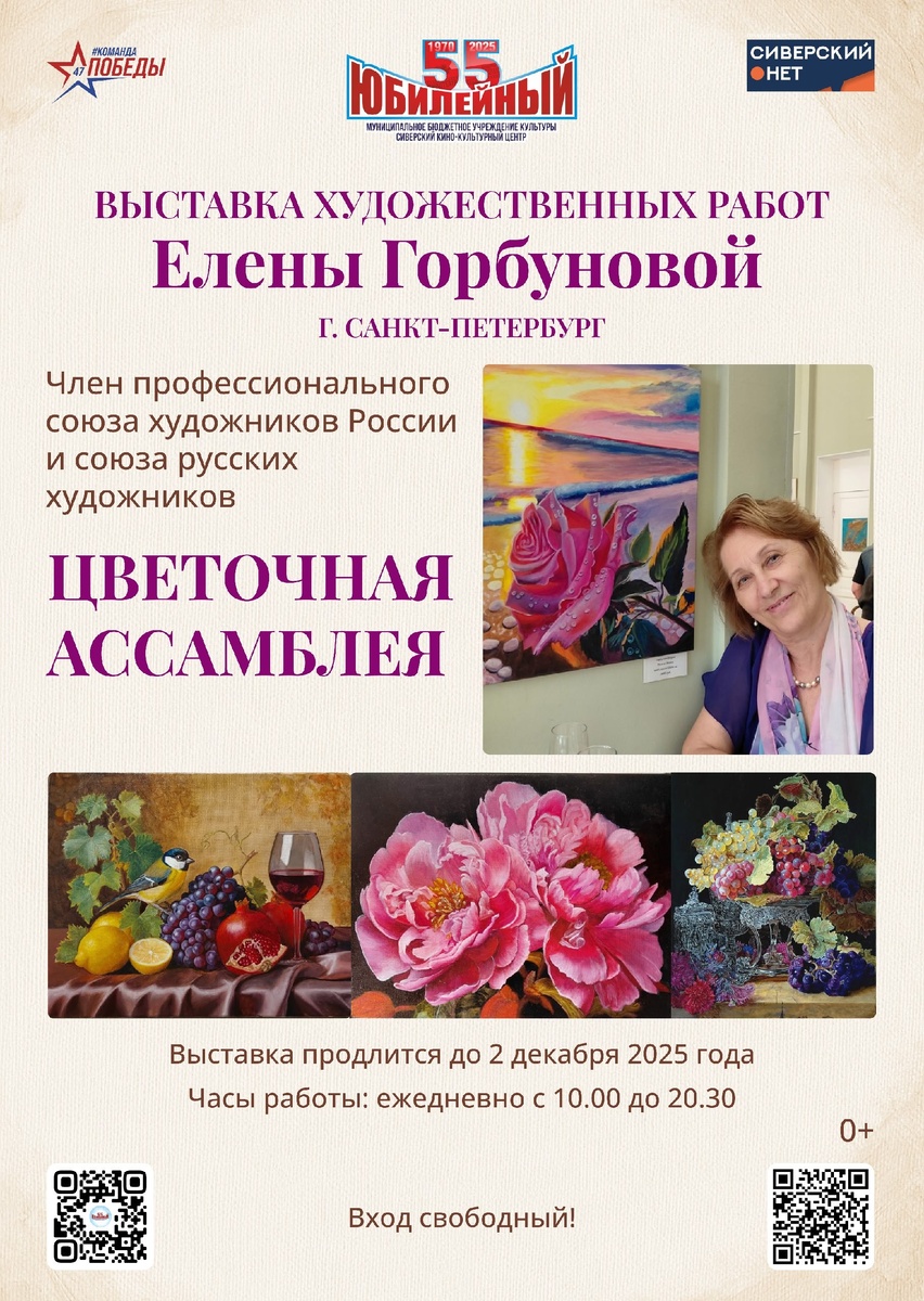 🎨Дорогие друзья! Приглашаем вас в МБУК СККЦ "Юбилейный" на выставку художественных работ Елены Горбуновой , г. Санкт - Петербург. Художница взяла кисть в руки в январе 2024 года. Начинала с акварели и акрила. С июня 2024 года пишет только маслом. С января 2024 года Елена написала более 150 картин. В июле 2025 г. стала членом Профессионального союза художников России и членом Союза русских художников. 2024-2025 гг. - студент художественной школы Александры Озеровой и «Artists School» Михаила Боярского, студии живописи Ольги Базановой, художественной школы NA-VI Надежды Ильиной. Елена Горбунова - молодой художник. Желание показать красоту окружающего мира у нее появилось внезапно. Как бабочка из кокона талант прорвался в мир. За полтора года из ученика, впервые взявшего кисть в руки, она доросла до «профессионального художника» и стала членом Профессионального союза художников России и членом Союза русских художников. Цветы, мифич Показать полностью... Наш канал в Max, вступайте