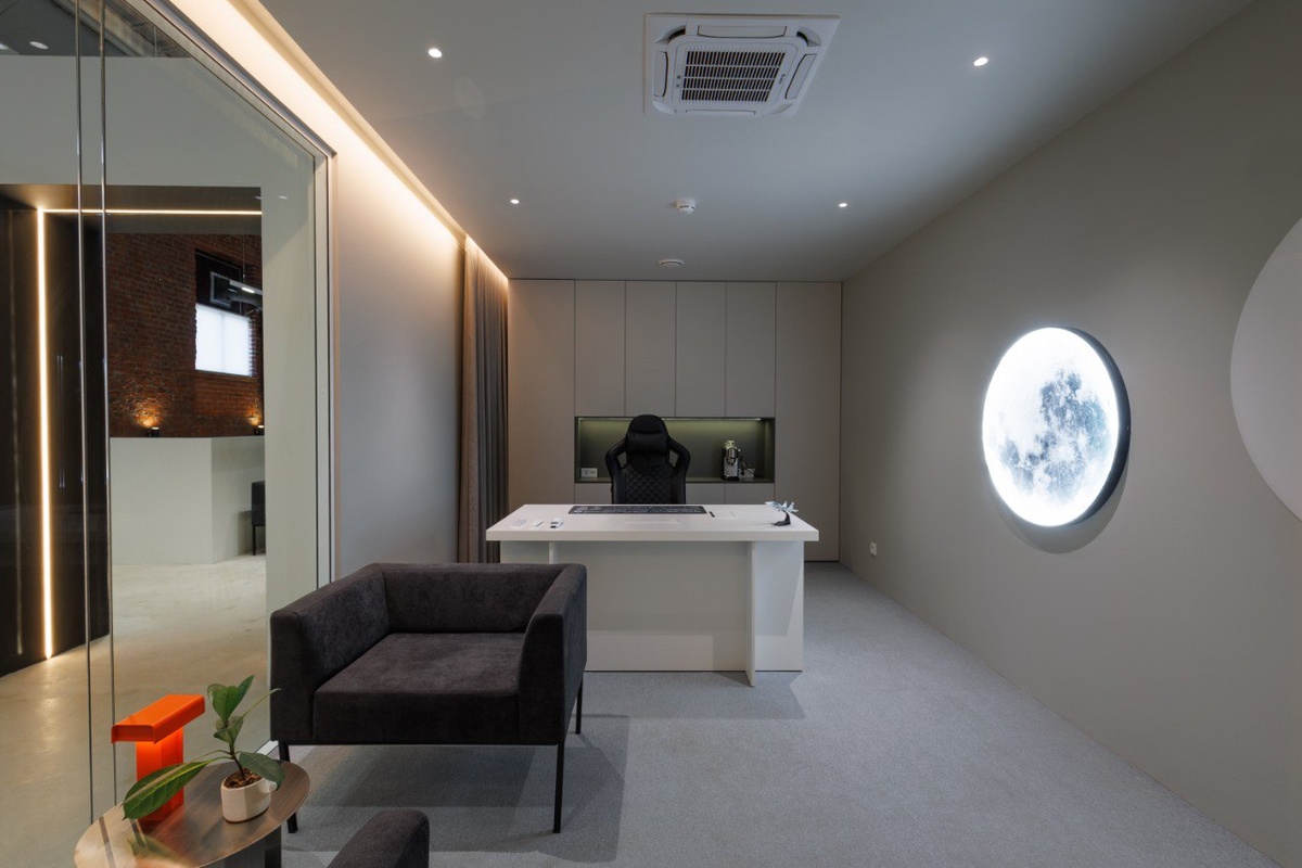 Закарнизная подсветка создаёт эффект «парящих» потолков, визуально увеличивает высоту кабинета и делает его более просторным