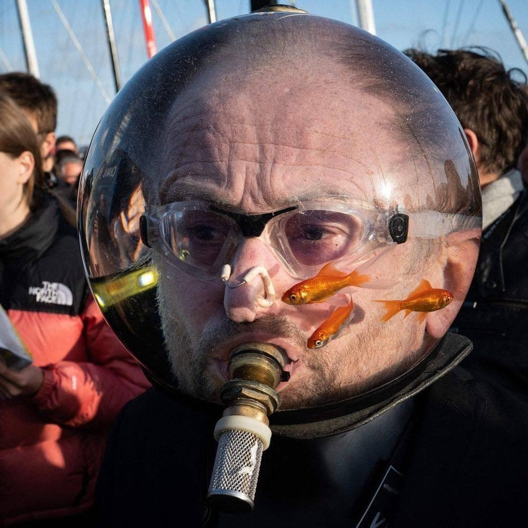 "The Aquamen", 2022 г. Theater group Machtiern Группа художников блуждала по улицам Парижа с аквариумами на головах. В аквариумах плавали живые золотые рыбки. 😃