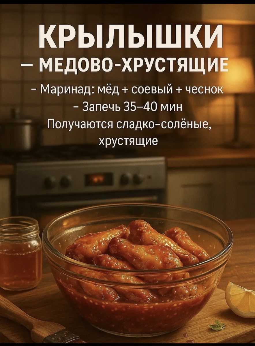 Хочется чего-то вкусного, простого и чтобы пальчики оближешь? Медово-хрустящие куриные крылышки — это тот самый вариант. Минимум ингредиентов, максимум аромата, и никакой возни на кухне. 🥘 Ингредиенты Куриные крылышки — 800 г Мёд — 2 ст. л. Соевый соус — 3 ст. л. Чеснок — 2–3 зубчика (можно заменить на ½ ч. л. сухого) Соль и перец — по вкусу 🍯 Маринад В отдельной миске смешайте: мёд, соевый соус, измельчённый чеснок. Перемешайте до однородности и залейте крылышки. Оставьте на 20–30 минут (можно и дольше — будет ещё вкуснее). 🔥 Запекание Разогрейте духовку до 200°С. Выложите крылышки на противень (лучше на бумагу или решётку). Запекайте 35–40 минут, один раз перевернув. Крылья получаются золотистые, сладко-солёные, с лёгкой карамельной корочкой и тем самым хрустом, от которого невозможно оторваться. 🍽 Советы для идеального результата Хотите сильнее хруст? Включите гриль на последние 5 минут. Любите остринку? Добавьте чайную ложку чили-соуса или паприки. Подава