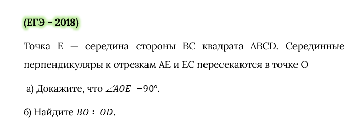 Здравствуйте, дорогие подписчики и гости канала Эта задача, я думаю, многим из вас давно знакома. Но я предложу, возможно, необычное решение, так что не закрывать статью Обычно ее решают через окружности, но я пошла другим путем. Смотрите сами. Обозначим длину квадрата за 2а и введем систему координат, за начало координат возьмем точку А Напишем уравнение прямой АЕ Напишем уравнение прямой ОК, серединного перпендикуляра к отрезку АЕ Напишем уравнение серединного перпендикуляра к отрезку ЕС И найдем координаты точки О, как точку пересечения после этого второй пункт решается очень быстро Спасибо за внимание, до новых встреч Буду рада вашим комментариям, лайкам и подписке на канал