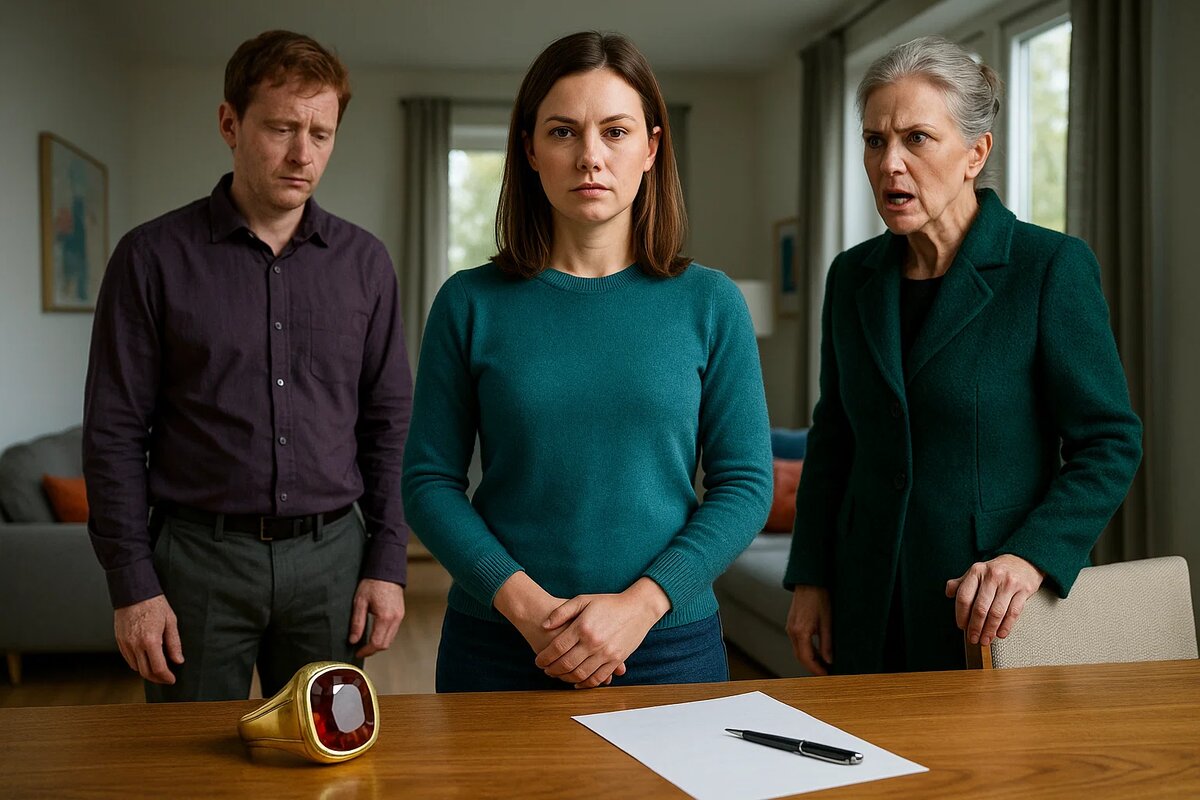 Марина поднялась в спальню, достала из шкатулки печатку — тяжёлое золотое кольцо с тёмно-красным камнем. Валентина Сергеевна называла его реликвией рода. Марина спустилась вниз, но не протянула печатку. Положила её на стол в гостиной. Рядом — чистый лист бумаги и ручку.