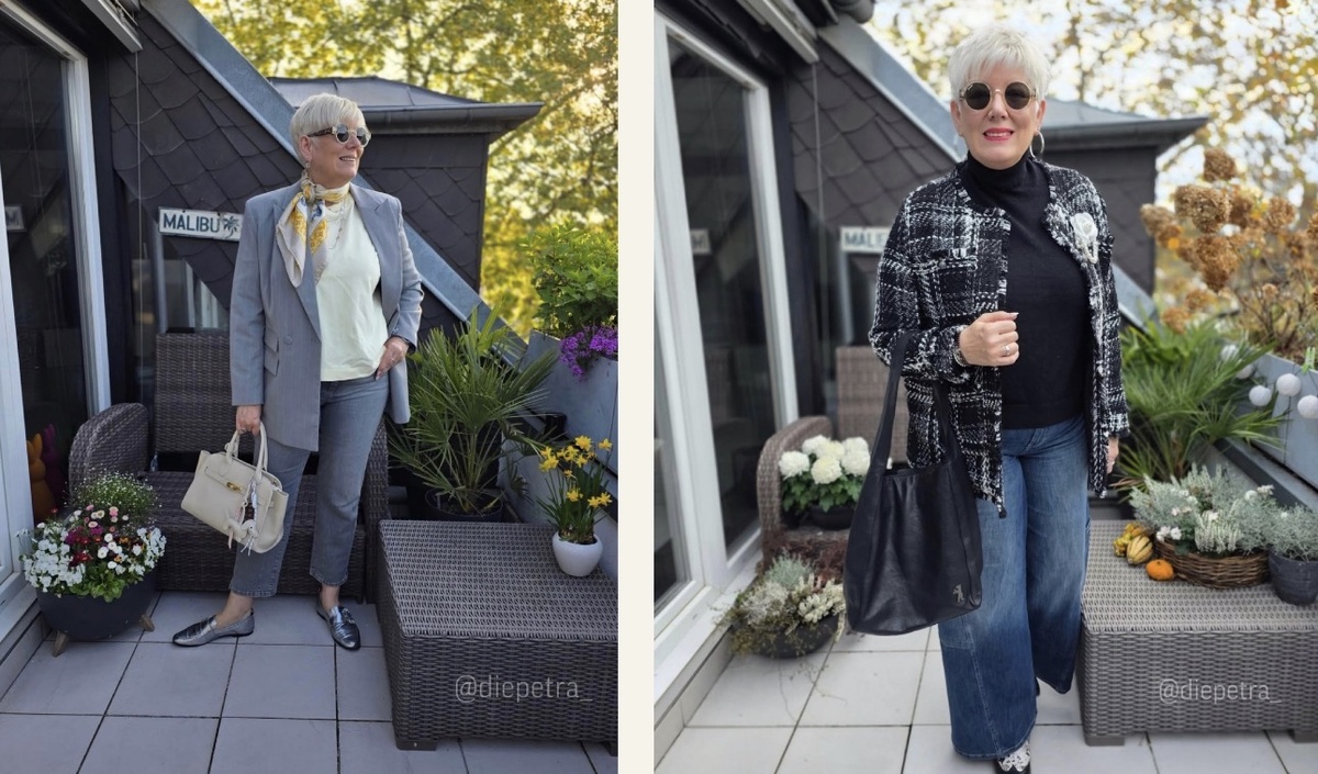 Возраст никогда не был преградой для красоты — но эта женщина напоминает об этом особенно убедительно. Её образы — пример того, как после 50 стиль становится интереснее, глубже и свободнее. Без попыток «омолодиться», без погонь за трендами. Только вкус, уверенность и правильные решения. Посмотрите на эти комплекты — каждый из них можно повторить, а эффект будет одинаковый: статусный, современный, выразительный образ взрослой женщины, которая знает себе цену. Нежное пальто, широкие джинсы, аккуратная рубашка — сочетание, которое делает образ свежим и небанальным. Почему работает: Этот комплект — пример того, как можно использовать цвет, не выглядя вычурно. Женственно, уверенно, небанально. Глубокий коричневый, фактура замши, аккуратный бант — здесь каждая деталь создаёт ощущение премиальности. Сильные стороны образа: Это образ, который выглядит статускно без единого логотипа. Чистое качество и вкус. Чёрная водолазка и широкие джинсы — база, которую украшает твидовый жакет. Ниче