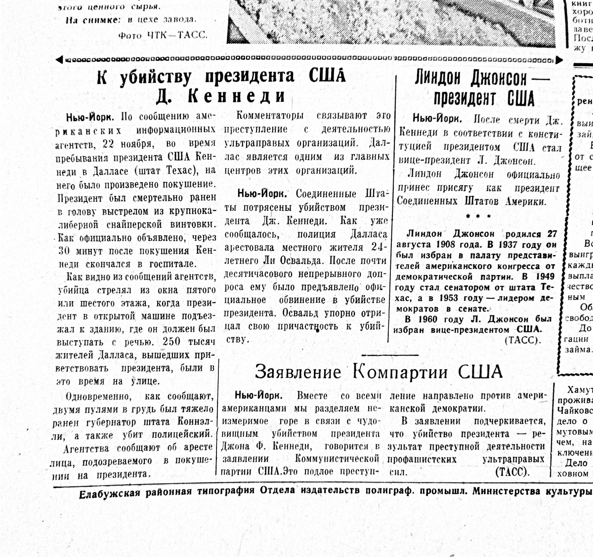 К очередной годовщине убийства американского президента Кеннеди. О событиях, произошедших в Далласе 22 ноября 1963 года, сообщила даже Елабужская "Новая Кама". Телевидение тогда было в зачаточном состоянии, радио тоже было не в каждом доме. О мировых новостях население узнавала через центральную прессу. Но и районные газеты также перепечатывали у себя важные сообщения ТАСС. Все в рамках политинформации. Не в каждом номере, выборочно и по чуть-чуть. Но убийство Кеннеди имело такой мощный резонанс, что в "Новой Каме" поместили не одну, а сразу несколько заметок об этом. По одному этому факту можно судить о том, какого значения для того времени была эта новость. В следующих номерах была помещена статья об убийстве подозреваемого Ли Харви Освальда: