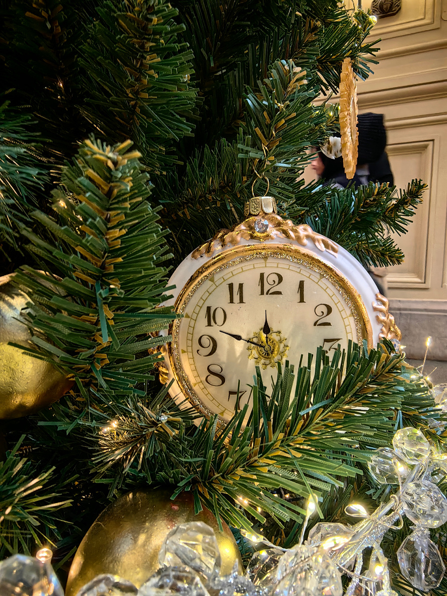 Ёлочка часового бренда (неудачно сфотографировала, не захватив постамент, и не могу теперь сказать, кто именно её установил) может похвастаться нежным оформлением в пёрышках, солнышках и часиках.
