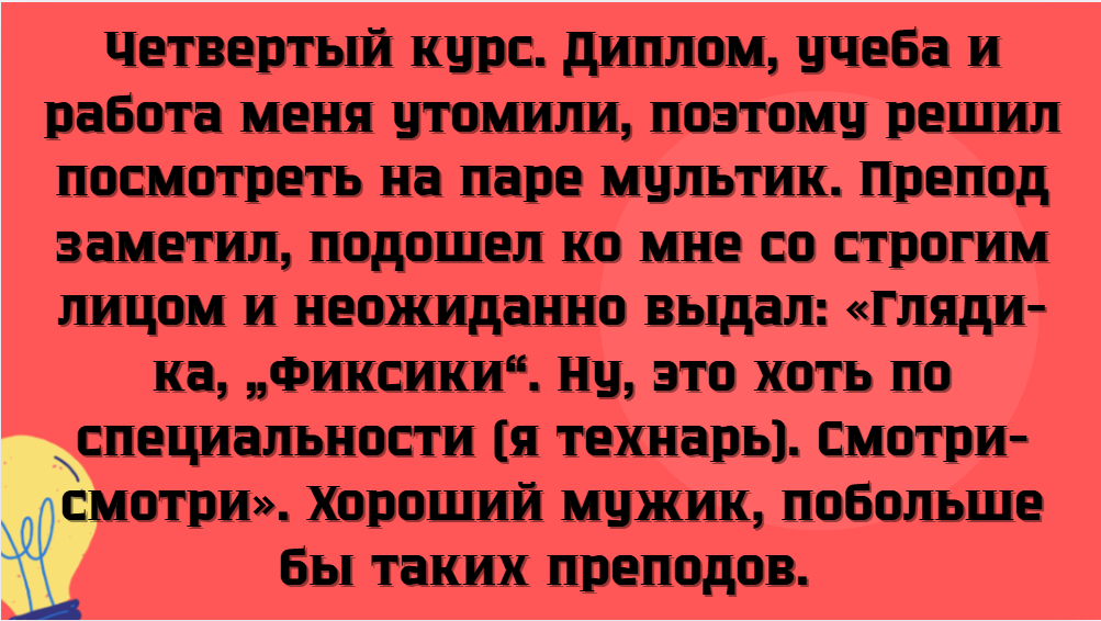 Годы учебы полны не только новыми знаниями, но и комичными ситуациями, которые запоминаются надолго. Школьники, студенты и их преподаватели иногда попадают в такие забавные истории, что хочется потом пересказывать их и близким, и незнакомцам из сети. Вот самые яркие из них. Спасибо, что дочитали статью до конца.