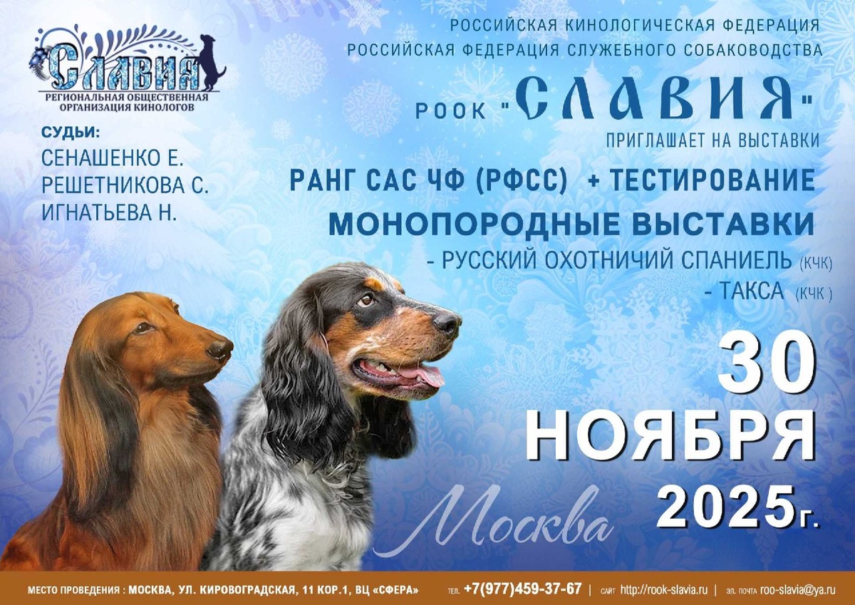 ⏰ 30 ноя (7д) 🏛 #Москва #Россия #Выставка 🐶 Выставка собак: Клуб собаководства «Славия» 🏆 Клуб собаководства «Славия» Контакты организаторов здесь: 🌐 https://www.petsman.ru/vystavki-sobak.php?mesto=39-moskva Выставка собак всех пород ранга САС (РФСС) Монопородная выставка "Такса"-ранг КЧК Монопородная выставка "Русский охотничий спаниель"-ранг КЧК Тестирование поведения 🧑 👨 Эксперты: 🔹 Сенашенко Е. В. 🔹 Решетникова С. А.