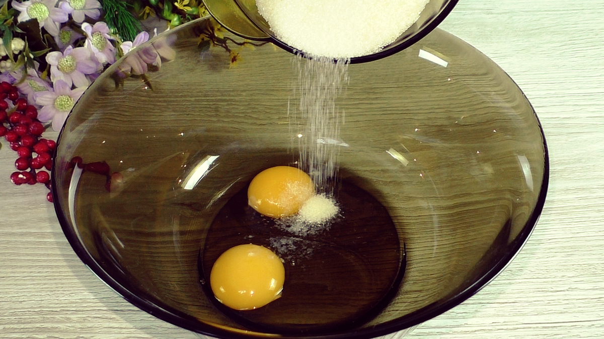 Смешать в миске яйца, соль и сахар. Сахара я добавила 100 г, пирог получился в меру сладкий. Если любите сладкую выпечку, количество сахара можно увеличить граммов на 30-40.