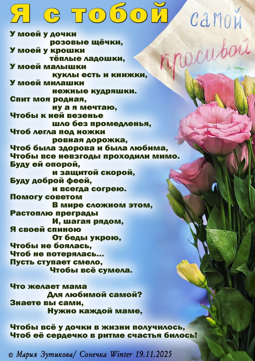Этот стих о той, которая восемь лет назад появилась в моей жизни и вдохнула в моё существование смысл, наполнила мой мир новыми ощущениями, научила меня по-другому чувствовать и видеть все вокруг. Она моя радость и моя любовь. Все мысли и переживания о ней... Дочка - маленькое чудо, которое сделало меня счастливой!