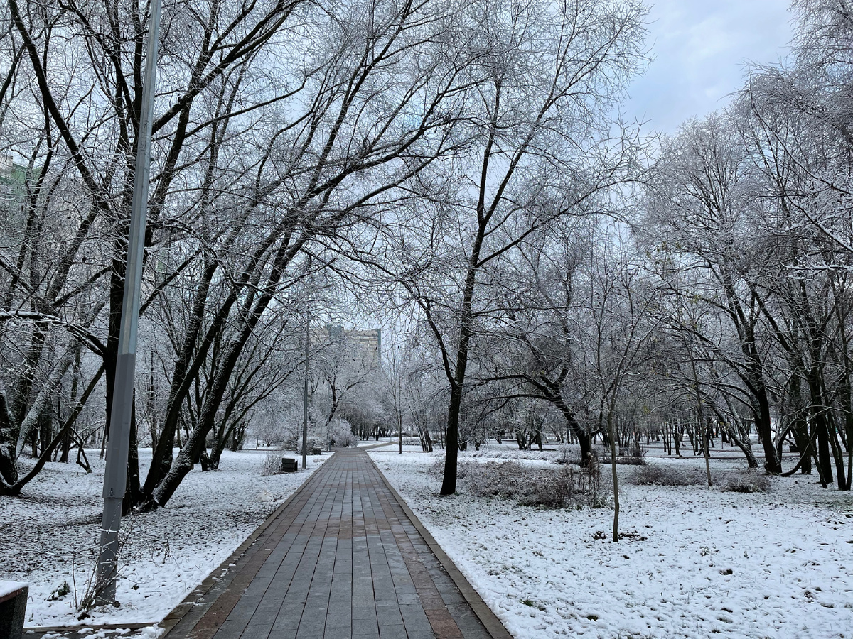 23 ноября 2025, воскресенье Зима началась в сквере, и сегодня на прогулке пошли зимние красоты. Пока что снежок жиденький ещё, но всё равно очень симпатично везде, куда повернёшься. Небо голубое просвечивает. У деревьев кроны на вид такие мягкие, что хочется их расчесать как волосы. Наверное, это оттого, что я вчера подстриглась. Такая ассоциация длинная возникает, мы не вдумываемся, нам приходит только конечный итог. А если назад отмотать, то вот как раз про волосы я вчера и думала. Стрижку выбирала. Размышляла на тему - может, совсем короткую сделать. Коротко обстриженные бабульки выглядят лучше, чем те, которые с хвостиком. У них такой ухоженный современный вид. Особо смелые идут ещё дальше - подбривают снизу стрижки. Я видела. Это совсем суперлихо. Опять же долго можно не тратиться на парикмахерские услуги. И отрастающие седые волосы смотрятся импозантно. Но если короткую стрижку я ещё могу вынести, то с бритыми участками могу и не пережить. В итоге попросила щадящее каре, чт